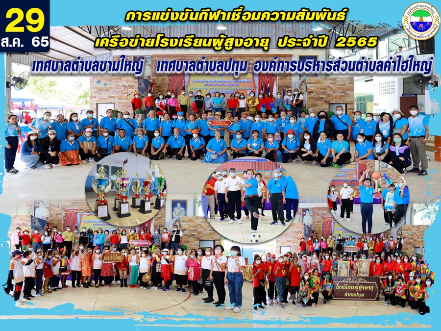 วันจันทร์, 29 สิงหาคม 2565 16:15วันจันทร์ที่ 29 สิงหาคม 2565 นางสาวกัญญ์ภัทร์ วีระพันธ์ นายกเทศมนตรีตำบลขามใหญ่ ประธานในพิธีเปิด "การแข่งขันกีฬาเชื่อมความสัมพันธ์เครือข่ายโรงเรียนผู้สูงอายุ ประจำปี 2565" โดยมีการแข่งขันระหว่างโรงเรียนผู้สูงอายุเทศบาลตำบลขามใหญ่ เทศบาลตำบลปทุม และองค์การบริหารส่วนตำบลคำไฮใหญ่ มีวัตถุประสงค์เพื่อเสริมสร้างสุขภาพที่ดีของผู้สูงอายุทั้งด้านร่างกายและจิตใจแบบองค์รวม สร้างความสัมพันธ์อันดีให้กับกลุ่มผู้สูงอายุทั้งภายในและภายนอกเขตเทศบาลตำบลขามใหญ่ ณ โรงเรียนเทศบาลขามใหญ่บ้านหนองไผ่ ตำบลขามใหญ่ อำเภอเมือง จังหวัดอุบลราชธานี ซึ่งการแข่งขันกีฬามี 3 ประเภท คือ กีฬาสากล กีฬาไทย และกีฬาพื้นบ้านมหาสนุก โดยสรุปผลการแข่งขัน ดังนี้