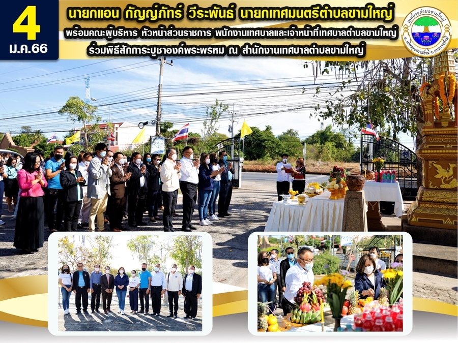 วันพุธ, 04 มกราคม 2566 15:07วันพุธที่ 4 มกราคม 2566 เวลา 09.00 น. นำโดย นางสาวกัญญ์ภัทร์ วีระพันธ์ นายกเทศมนตรีตำบลขามใหญ่ พร้อมคณะผู้บริหาร หัวหน้าส่วนราชการ พนักงานเทศบาลและเจ้าหน้าที่เทศบาลตำบลขามใหญ่ ร่วมพิธีสักการะบูชาองค์พระพรหม ซึ่งถือปฏิบัติกันมาอย่างต่อเนื่อง เพื่อสร้างวัฒนธรรมองค์กรที่ดี สร้างขวัญกำลังใจและเพื่อความเป็นสิริมงคลให้แก่บุคลากรในหน่วยงาน ณ บริเวณหน้าสำนักงานเทศบาลตำบลขามใหญ่ อำเภอเมืองอุบลราชธานี จังหวัดอุบลราชธานี