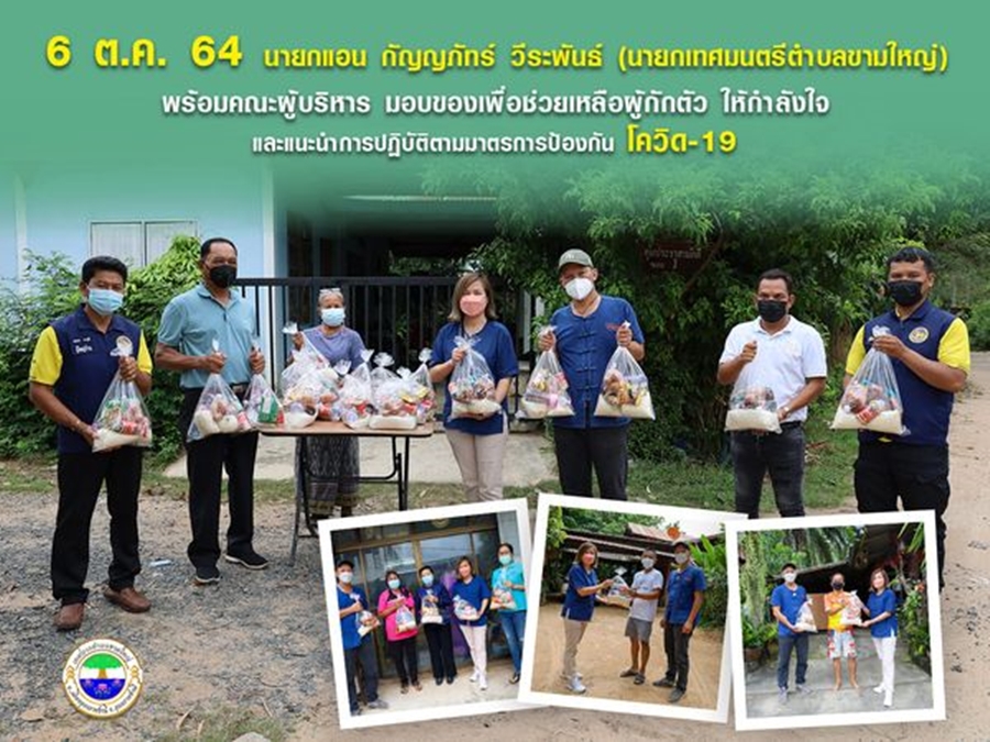 วันพุธ, 06 ตุลาคม 2564 16:50วันพุธที่ 6 ตุลาคม 2564 นางสาวกัญญ์ภัทร์ วีระพันธ์ นายกเทศมนตรีตำบลขามใหญ่ พร้อมด้วยเจ้าหน้าที่เทศบาลตำบลขามใหญ่ ลงพื้นที่เยี่ยมให้กำลังใจและให้คำแนะนำในการปฏิบัติตัวตามมาตรการป้องกันเชื้อไวรัสโคโรนา(Covid-19) รวมถึงมอบถุงยังชีพให้กับผู้กักตัวในพื้นที่ตำบลขามใหญ่ ในนามเทศบาลตำบลขามใหญ่ ขอขอบพระคุณทุกท่านที่มีจิตอาสาในการบริจาคขอให้ท่านจงมีแต่ความสุขความเจริญ