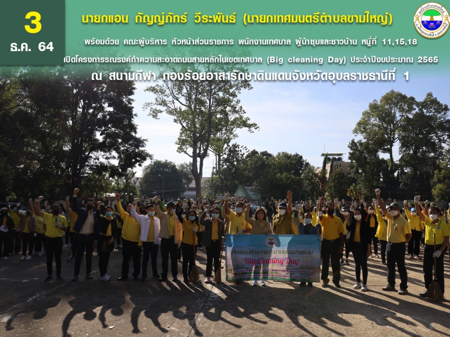 วันศุกร์, 03 ธันวาคม 2564 14:29วันศุกร์ที่ 3 ธันวาคม 2564 เวลา 08.30 น. ณ สนามกีฬา กองร้อยอาสารักษาดินแดนจังหวัดอุบลราชธานีที่ 1 นางสาวกัญญ์ภัทร์ วีระพันธ์ นายกเทศมนตรีตำบลขามใหญ่ เป็นประธานเปิด #โครงการรณรงค์ทำความสะอาดถนนสายหลักในเขตเทศบาล ประจำปีงบประมาณ 2565 (Big Cleaning Day) ครั้งที่ 1 โดยมี คณะผู้บริหาร สมาชิกสภาเทศบาลตำบลขามใหญ่ หัวหน้าส่วนราชการ พนักงานเทศบาล พร้อมด้วยกำนัน ผู้ใหญ่บ้าน ประชาชนในเขตพื้นที่ตำบลขามใหญ่ หมู่ที่ 11 บ้านหนองปลาปาก, หมู่ที่ 15 บ้านนาคำ และหมู่ที่ 18 บ้านดอนกลาง เข้าร่วมกิจกรรม ซึ่งกิจกรรมดังกล่าวจัดขึ้นเพื่อให้ประชาชนมีส่วนร่วมในการพัฒนาชุมชน สร้างจิตสำนึกให้ประชาชนมีส่วนร่วมในการรักษาความสะอาด ความเป็นระเบียบเรียบร้อยของบ้านเมือง และทำให้เกิดทัศนียภาพที่สวยงาม #บริเวณถนนคลังอาวุธ ตำบลขามใหญ่ อำเภอเมืองอุบลราชธานี จังหวัดอุบลราชธานี
