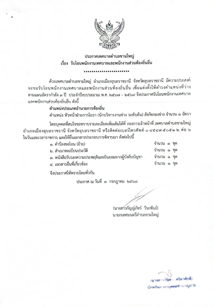 วันจันทร์, 17 พฤศจิกายน 2568 11:22ประกาศเทศบาลตำบลขามใหญ่ เรื่อง รับโอนพนักงานเทศบาลและพนักงานส่วนท้องถิ่นอื่น เพื่อแต่งตั้งให้ดำรงตำแหน่งว่าง ตามแผนอัตรากำลัง ๓ ปี (พศ. ๒๕๖๗ - ๒๕๖๙) จึงประกาศรับโอนพนักงานเทศบาล จึงประกาศรับโอนพนักงานเทศบาลและพนักงานส่วนท้องถิ่นอื่น ดังนี้